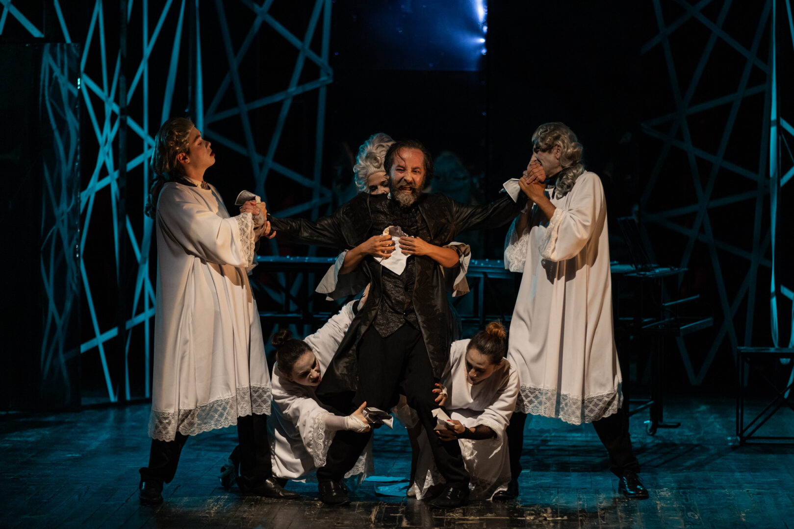 Драмскиот репертоар на фестивалот „Охридско лето“ вчеравечер донесе премиера на театарската претстава „Амадеус“ од Петар Шефер, во режија на Андреј Цветановски, а во изведба на Турски театар-Скопје. Селпин Ќерим, Јеткин Сезаир, Слаѓана Вујошевиќ, Аксел Мехмет, Џенап Самет, Бурханедин Ибрахим, Емине Халил, Озан Илдриз и Игбал Саидова на сцената во Центарот за култура „Григор Прличев“ покажаа врвна актерска игра, носејќи ја приказната за Моцарт и за неговите талент и генијалност. Во полето на музиката, еден од малкуте кои го задолжиле човештвото со своите композиции и оставиле печат на своето време е Волфганг Амадеус Моцарт. Но не и признание од своите современици. Освен од еден, Антонио Салиери, неговиот вечен непријател и единствениот човек кој ја препознава неговата генијалност. И заради таа генијалност, тој станува негов најголем непријател. Салиери, го носи проклетсвото да ја познава музиката толку добро да може да го препознае божественото во Моцарт, но никогаш да не создаде нешто толку совршено. -Оваа претстава зборува за едно чувство што го носиме многу од нас уметниците, а тоа се јавува секогаш кога ќе дојдеме во контакт со генијалноста на некакво поле. Моцарт бил еден од тие луѓе, некако во своето време непризнаен од публиката и општеството бидејќи бил најверојатно пред своето време. Само Салиери кој можел да ја препознае таа генијалност пробува да го рационализира фактот дека тоа не е можно да е некој човек, туку мора Господ да зборува преку него. Тоа претставува еден триаголник на борба помеѓу Салиери, Господ и инструментот на Господ-Моцарт. Низ таа призма се обидовме да создадеме, и мислам дека создадовме претстава којашто тече како една музичка партитура. Се надевам дека публиката уживаше во неа и се надевам дека успеавме да ги отвориме тие прашања за генијалноста и просечноста како што би рекол Салиери и судирот меѓу двете, рече режисерот Андреј Цветаноски. Цветаноски не го поставува Шефер првпат на сцената а според него, актерите од Турскиот театар се посебни по многу нешта. -За мојата дипломска работа ја работев претставата „Салиери“ според текстот „Амадеус“ од Питер Шефер и уште тогаш бев решен и сакав уште еднаш да ја поставам пак, со повеќе ликови бидејќи првата беше доста камерна. Многу ми е драго што соработувам со Турскиот театар и заедно со нив најдовме заеднички јазик во однос на тоа да се оствари таа моја желба да го работам „Амадеус“ повторно бидејќи турскиот ансамбл е навистина посебен по многу нешта а најмногу по подготвеноста да играат заедно и да играат во рамките на концептот за којшто сме се договориле и тоа да го прават до крај, појасни режисерот на претставата „Амадеус“, Андреј Цветаноски. Талентот како категорија се оценува и проценува низ текот на историјата и претставува вредна особина на една личност. Иако тоа е категорија која е субјективна и лична, вистинскиот квалитет не може да се оспори, ако не веднаш, тогаш после времето на личноста која ги создава делата. -И мене ме допира овој текст затоа што сите го имаме внатре она да се споредуваме со другите уметници наместо да останеме во контакт со себе и со тоа што ние како уметници сакаме да го направиме.Многу често знаеме да избегаме надвор и да се споредуваме со другите. Да го споредуваме нашиот порив за креација со туѓиот порив за креац