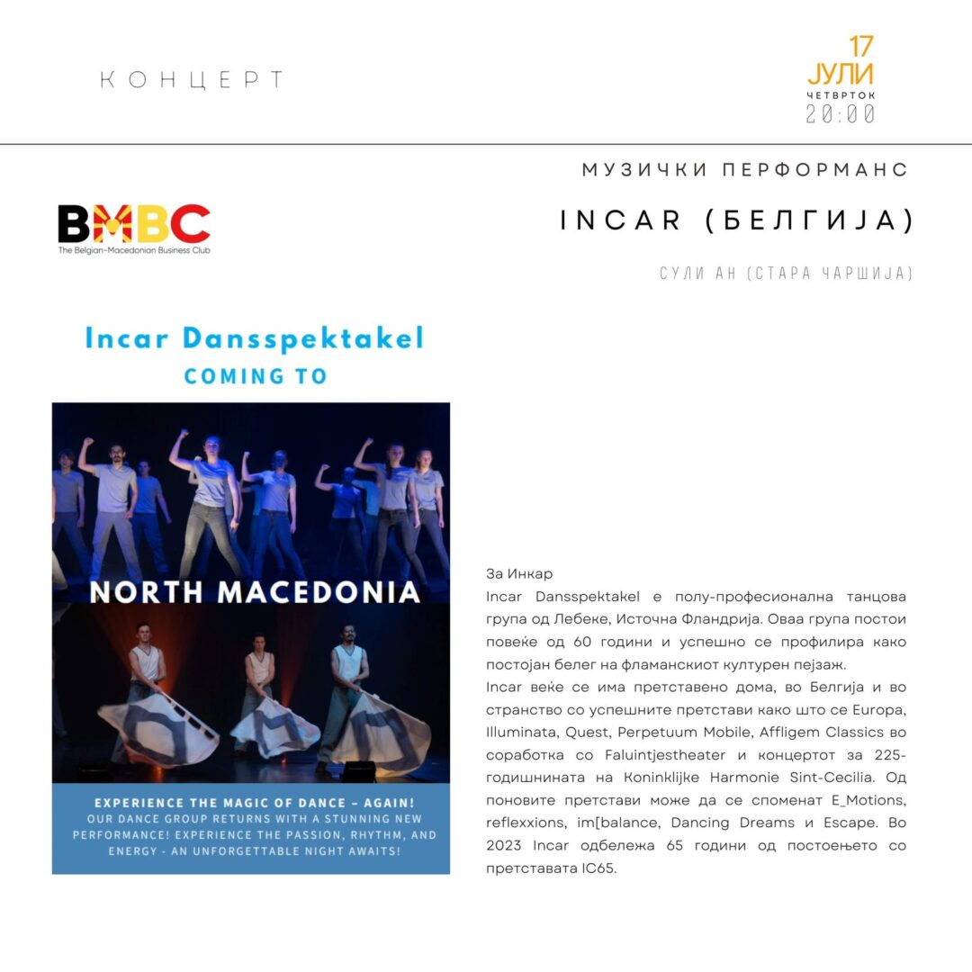 Вечерва со почеток во 20:00 часот во Сули ан, ќе се одржи музички перформанс на белгиската танцова група „Incar“. „Incar Dansspektakel“ е полу-професионална танцова група од Лебеке, Источна Фландрија. Оваа група постои повеќе од 60 години и успешно се профилира како постојан белег на фламанскиот културен пејзаж. Incar веќе се има претставено дома, во Белгија, и во странство со успешните претстави како што се „Europa“, „Illuminata“, „Quest“, „Perpetuum Mobile“, „Affligem Classics“ во соработка со Faluintjestheater и концертот за 225-годишнината на Koninklijke Harmonie Sint-Cecilia. Од поновите претстави може да се споменат „E_Motions“, „reflexxions“, „im[balance“, „Dancing Dreams“ и „Escape“. Во 2023 година Incar одбележа 65 години од постоењето со претставата „IC65“.
