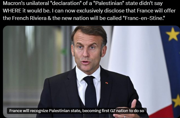 Во низ објави на социјалната мрежа X, американскиот амбасадор во Израел, Мајк Хакаби, ја исмеа најавата на францускиот претседател Емануел Макрон дека Париз ќе признае палестинса држава во септември, пишува „Тајмс оф Израел“. „Колку генијално! Ако Макрон може само да „прогласи“ постоење на држава, можеби Велика Британија може да ја „прогласи“ Франција за своја колонија!“, напиша тој. Тој додаде во следна објава: „Едностраното „прогласување“ на Макрон за „палестинска“ држава не кажа каде би била таа држава. Сега можам ексклузивно да откријам дека Франција ќе ја понуди Француската ривиера, а новата држава ќе се вика „Franc-en-Stine“, додаде тој во следна објава. Франција ќе ја признае палестинската држава на Генералното собрание на ОН во Њујорк во септември, објави вчера францускиот претседател Емануел Макрон на социјалните медиуми, предизвикувајќи жестоки критики од Израел и воодушевување од Палестинците. „Верен на мојата историска посветеност на праведен и траен мир на Блискиот Исток, одлучив Франција да ја признае Државата Палестина. Ќе го дадам официјалното соопштение на Генералното собрание на Обединетите нации во септември“, напиша францускиот шеф на државата на X и Инстаграм. До денес, најмалку 142 земји признале палестинска држава, според АФП. САД и Израел се одлучно против таков проект. „Итна потреба денес е да се стави крај на војната во Газа и да се спаси цивилното население“, нагласи францускиот претседател на X. Во овој контекст, „конечно мора да изградиме палестинска држава, да ја обезбедиме нејзината одржливост и да обезбедиме дека со прифаќање на нејзината демилитаризација и целосно признавање на Израел, таа придонесува за безбедноста на сите на Блискиот Исток“, додаде тој. Фото: принтскрин